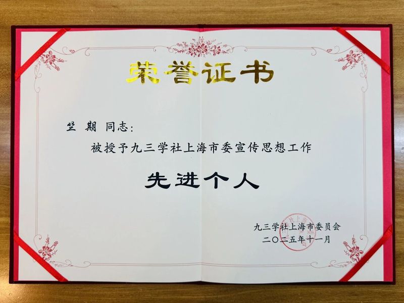 12月5日,九三学社上海市委2025年宣传思想工作会议在民主党派大厦召开。beat365英国官方网站音乐戏剧系副教授、硕士研究生导师、声乐教研室副主任竺期荣获九三学社上海市委宣传思想工作先进个人。