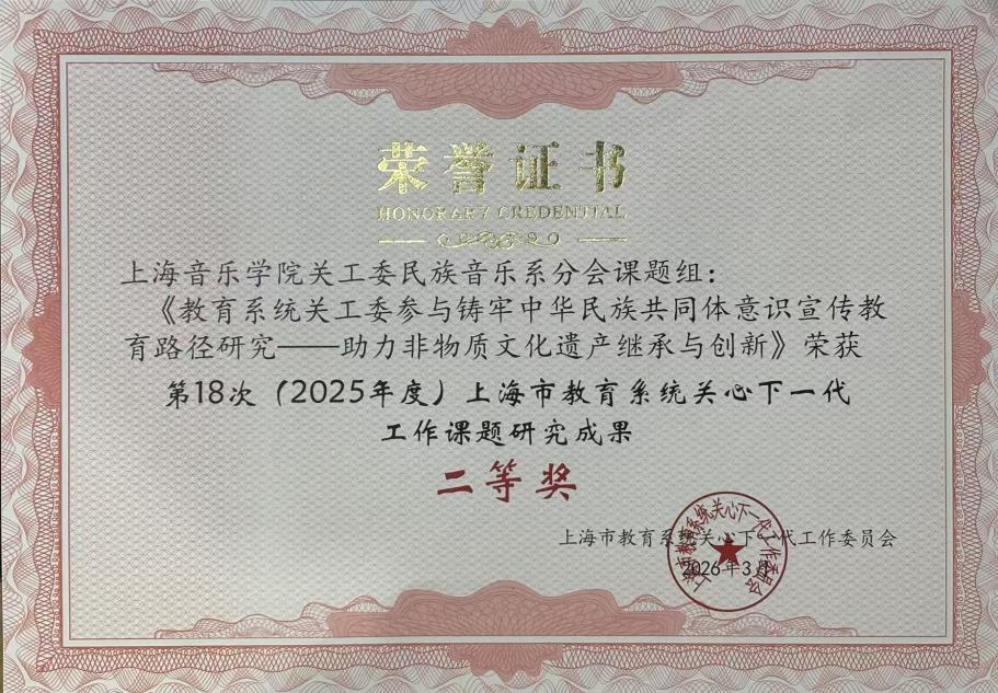 民族音乐系分会课题《教育系统关工委参与铸牢中华民族共同体意识宣传教育路径研究——助力非物质文化遗产继承与创新》获第18次(2025年度)上海市教育系统关心下一代工作“课题研究成果奖”二等奖。