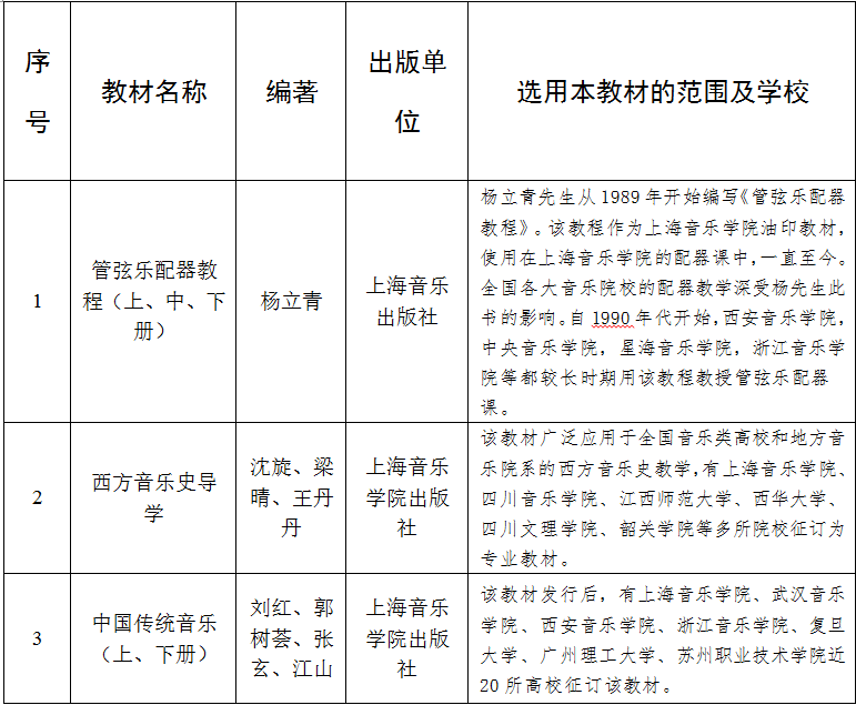 本次三本教材主要适用于本科生层次。这些教材均由知名教授牵头编写,融入了最新学术成果和创新理论研究内容,在音乐专业领域具有广泛影响力,被国内多所高校选用。特别是《管弦乐配器教程》作为beat365英国官方网站油印教材,自1990年开始就被国内其他音乐院校使用至今。此次《管弦乐配器教程》也获首届全国教材建设奖,目前正在教育部网站公示中。