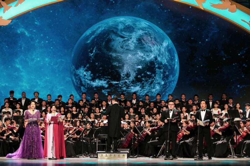 廖昌永、黄英、董芳携手男高音歌唱家,上音校友韩蓬,与著名指挥家张艺率领的上海爱乐乐团、上海歌剧院合唱团同台献艺,上演了贝多芬第九交响曲第四乐章《欢乐颂》。辉煌的乐曲表达了天下大同的宏大情怀和构建人类命运共同体的美好愿景。