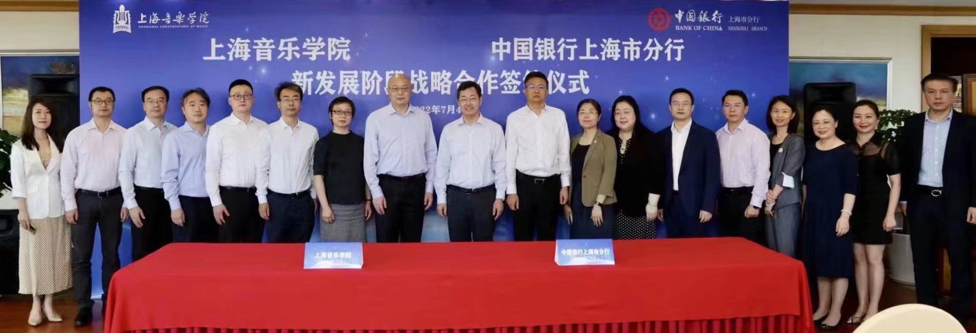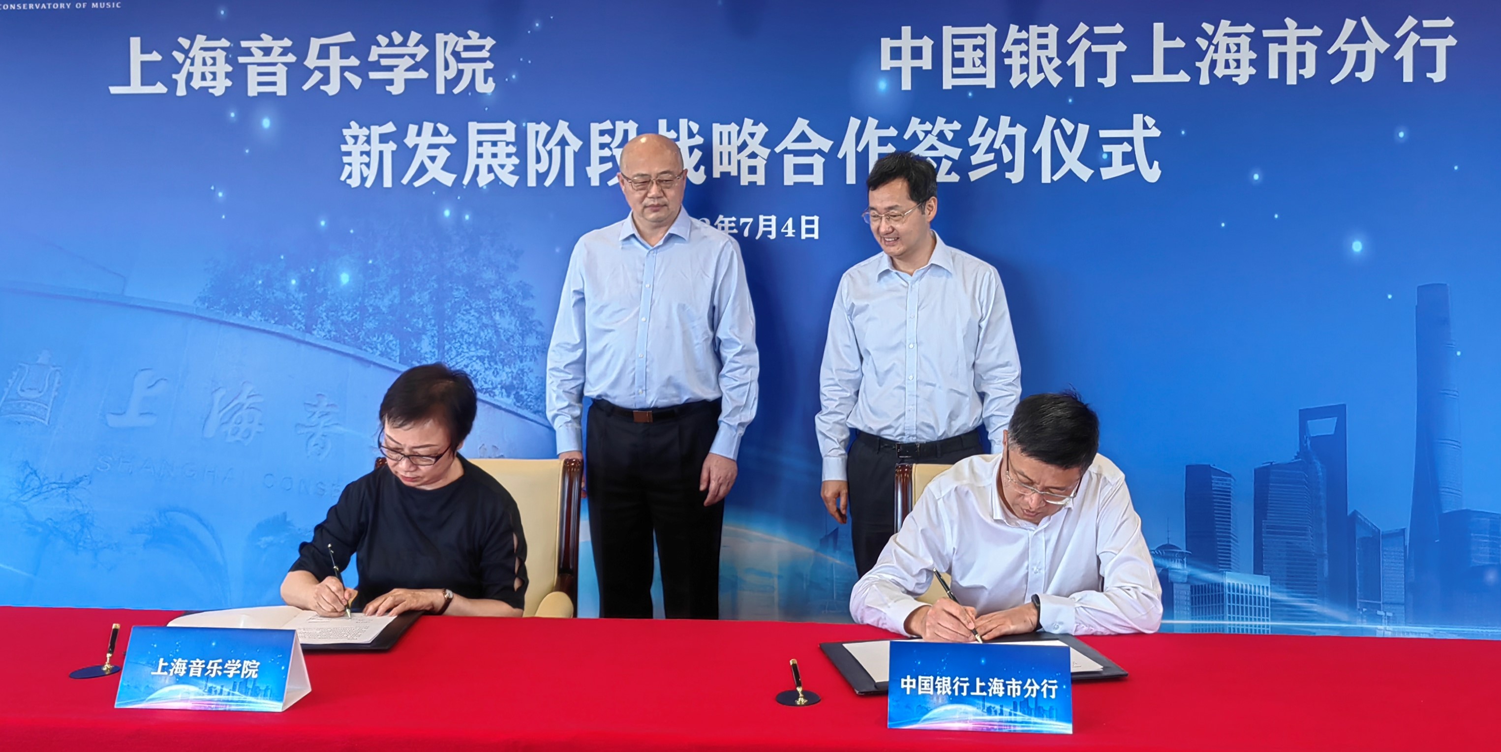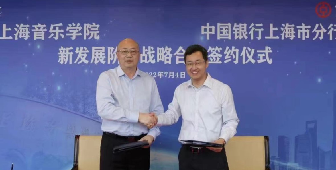 2022年7月4日,beat365英国官方网站与中国银行上海市分行签约仪式在中银大厦隆重举行。上音党委书记徐旭书记、中行上海分行党委书记、行长张守川代表双方签署《新发展阶段战略合作协议》,上音总会计师张佳春、中行上海分行资深客户经理杨军代表双方签署《三年行动计划》。此次签约,标志着双方建立新时代全面战略合作伙伴关系。