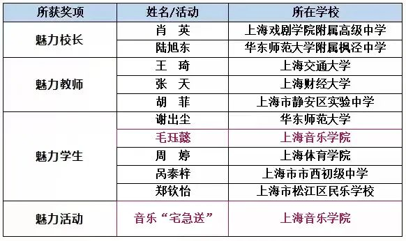 上音院长廖昌永、音乐教育系副主任王海灵分别当选魅力校长和魅力教师;上音音乐戏剧系学子毛珏懿荣获魅力学生提名奖,上音音乐“宅急送”荣获魅力活动提名奖。