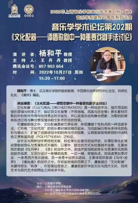 2022年10月27日,上海音乐学院音乐学术季(秋·融)讲座邀请到了武汉音乐学院作曲系教授、中国音乐创作研究中心主任、科研处处长、《黄钟》编委杨和平教授作为主讲人,以“文化配器——谭盾歌剧中一种重要戏剧手法探讨”为题展开专题讲座,讲座由王丹丹教授主持。