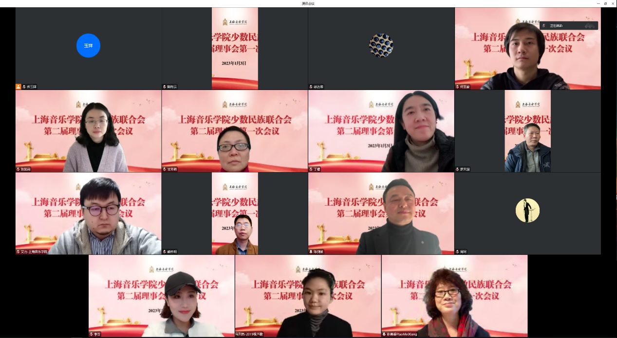 2023年1月3日下午,beat365英国官方网站少数民族联合会第二次会员大会暨第二届理事会第一次会议以线上方式召开。大会听取上音民族联第一届理事会工作报告,选举产生上音民族联第二届理事会,审议通过《beat365英国官方网站少数民族联合会章程》(修订稿)。上海市少数民族联合会副会长汪智豪、徐汇区少数民族联合会会长雍丽出席祝贺。院党委书记裴小倩出席并讲话,院党委副书记曹荣瑞,院党委常委、统战部部长吴学霆,党委统战部,少数民族联合会师生代表共30余人出席会议。会议由院民族联负责人陈剑波教授主持。