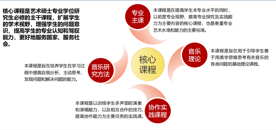顺应教育部新一轮学科目录调整后带来的新变化,以提升“育人”能力为逻辑起点,研究生部从艺术硕士专业学位研究生课程体系、音乐专业学位研究生核心课程等方面进行全面思考,推行新课程研发。全年开展艺术硕士专业学位研究生核心课程建设,有机结合侧重实践性的专业主干课、协作实践课与侧重理论性的音乐研究方法课、音乐理论课,共同构成研究生教育核心课程体系。目前,在培养方案所规定的学分要求中,作曲、音乐科技、艺术管理、数字媒体艺术等专业的硕士研究生核心课程占总学分的42.3%,表演类专业的硕士研究生核心课程占总学分的46.2%,占比均接近一半。