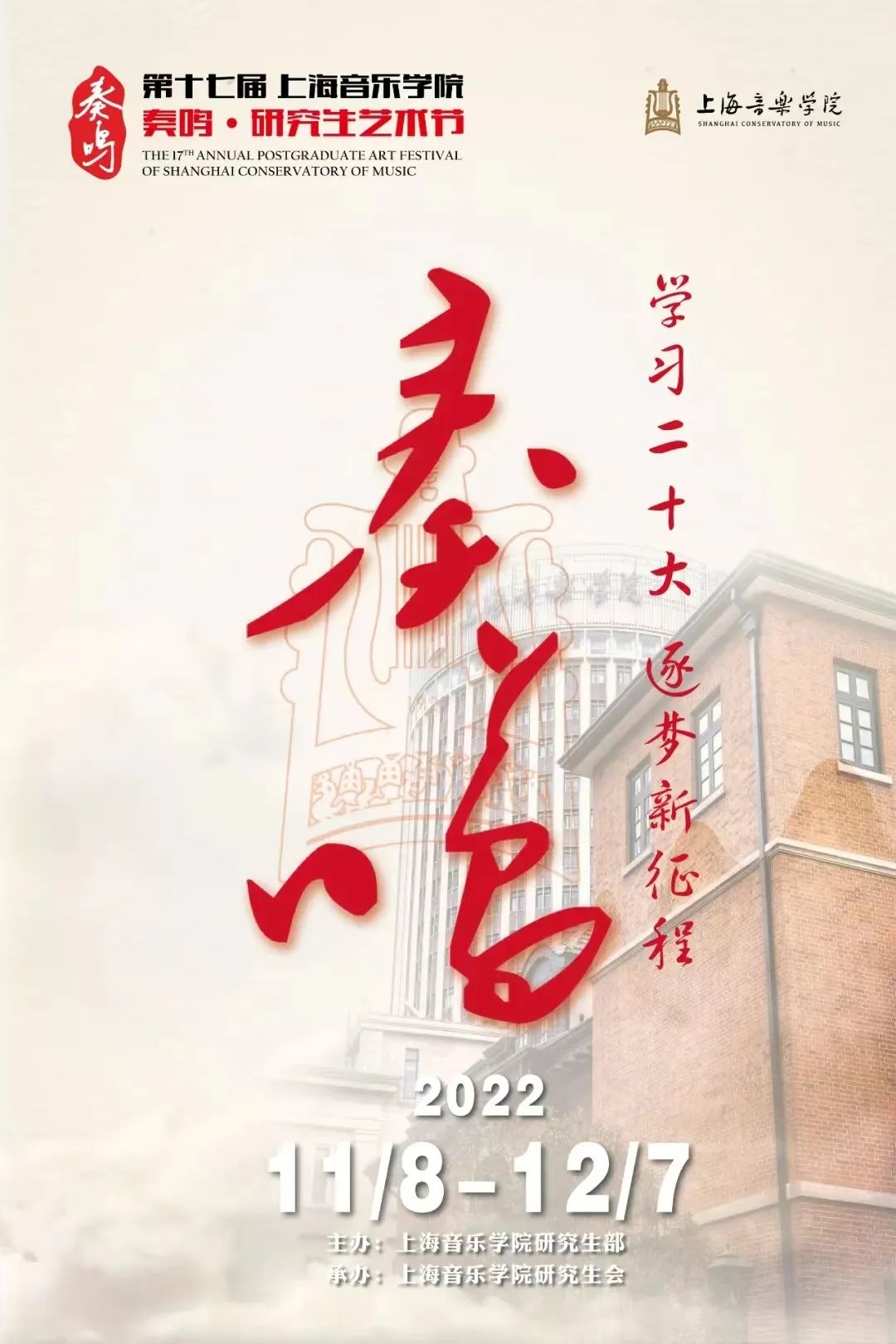 11月8日至12月7日,上音研究生艺术实践、展示才艺、交流思想的重要舞台——第十七届“奏鸣·研究生艺术节”举行。本届艺术节以“学习二十大,逐梦新征程”为主题,包含一场新生音乐会、一场研究生原创作品音乐会、一场研究生歌剧选段专场音乐会、一场室内乐作品音乐会、两场博士生科研课题项目中期汇报会、两场乐谈分享会、三场讲座、八场读书会、一场作曲大师班、一场乐器工作坊、一场研究生论坛,旨在激发上音研究生的学术积极性,点燃研究生的创作热情,使研究生在新征程上怀抱梦想、脚踏实地。