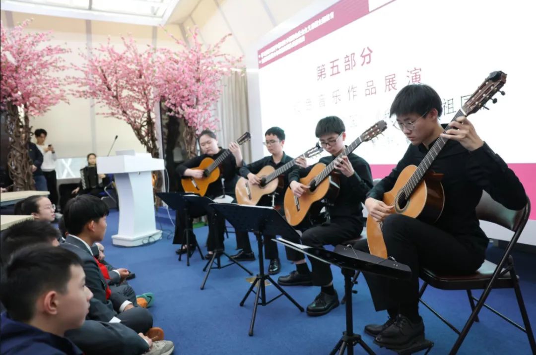 两校学子现场以“政治生日”的形式,重温入党誓词。随后,上音学子献上红色音乐作品展演,包括附中学生张少宏、马映菲、储义轩、戴民博带来的吉他四重奏《歌唱祖国》《我和我的祖国》和现打系本科学生黄合洁的手风琴独奏《牧民之歌》。
