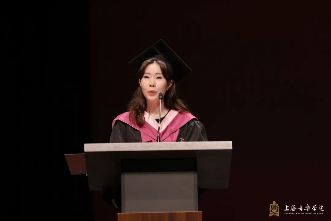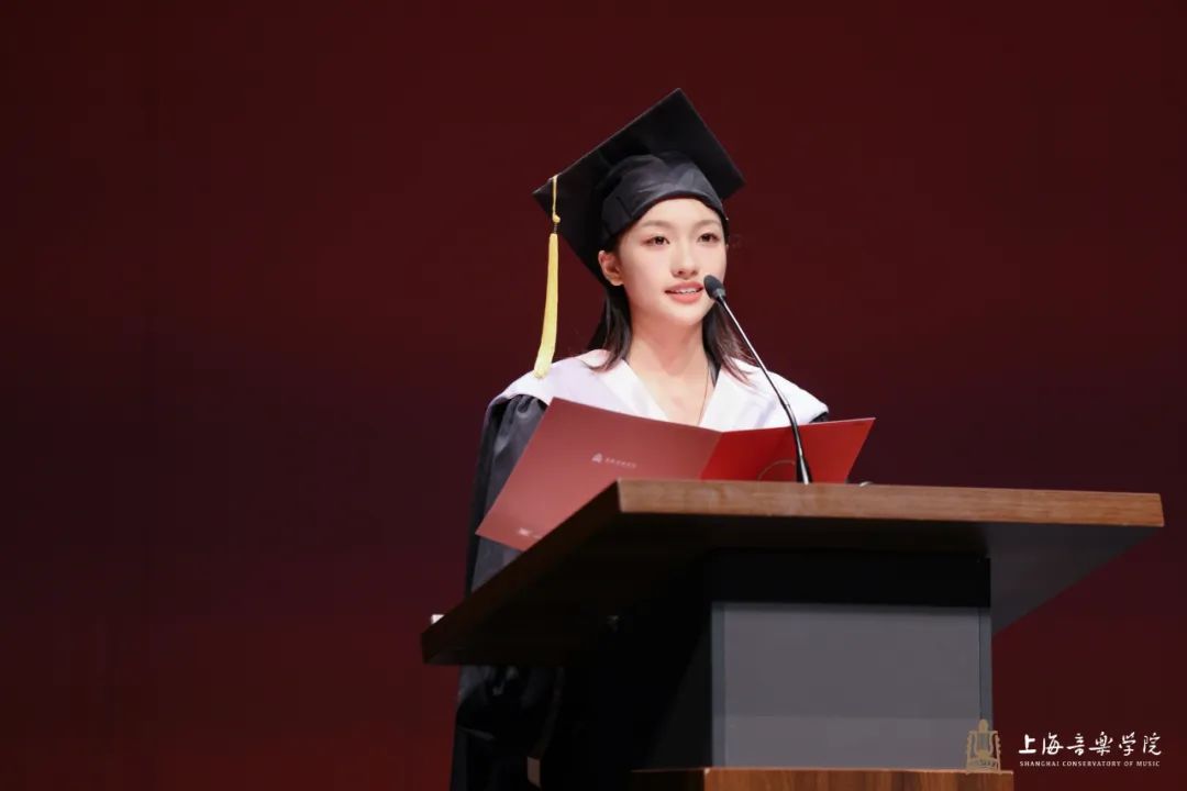 本科毕业生代表郑迪同学,表达了对母校的感激、对同学的不舍和对未来的憧憬,希望同学们时刻保持上音人对艺术尽善尽美的追求。