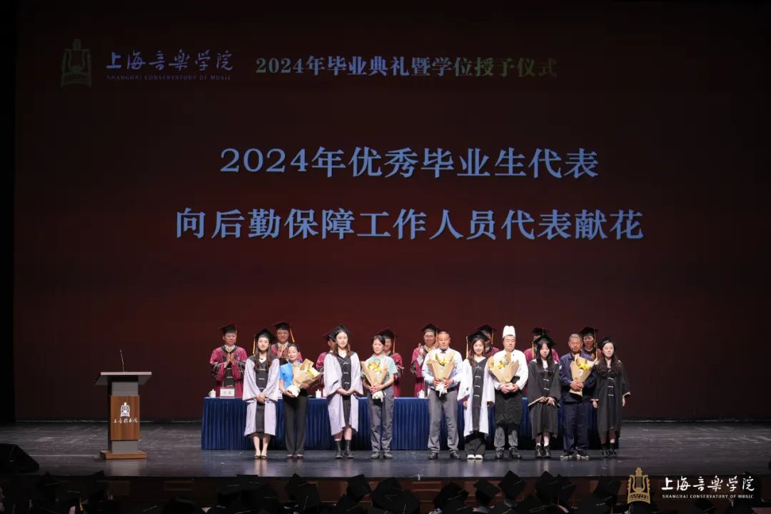 优秀毕业生代表向宿管、保洁、门卫、食堂工作人员以及琴房管理者等后勤保障工作人员献花,对他们的辛勤付出表达感激之情。