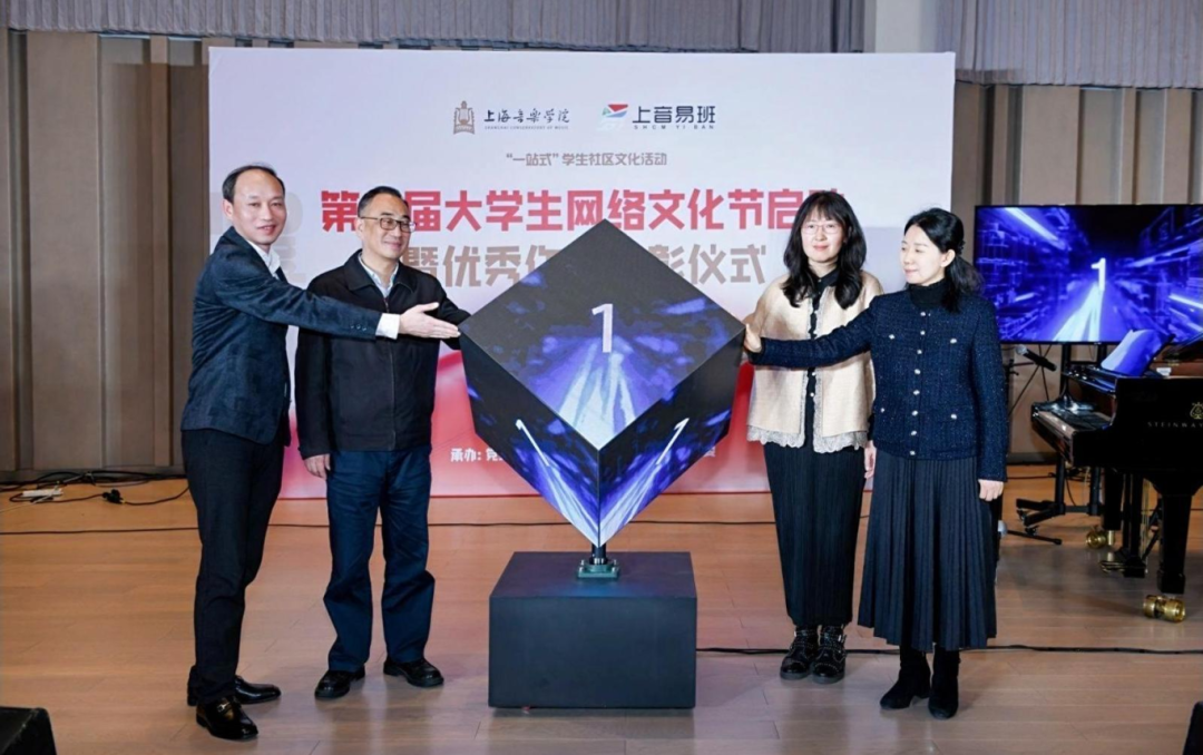 在启动仪式上,徐卫、彭东恺、李玥玮、欧阳佳沁共同点亮启动灯,转动的蓝色魔方球勉励上音学子在第二届大学生网络文化节中继续深耕,展现beat365官网学生特长,歌唱文化与情怀。