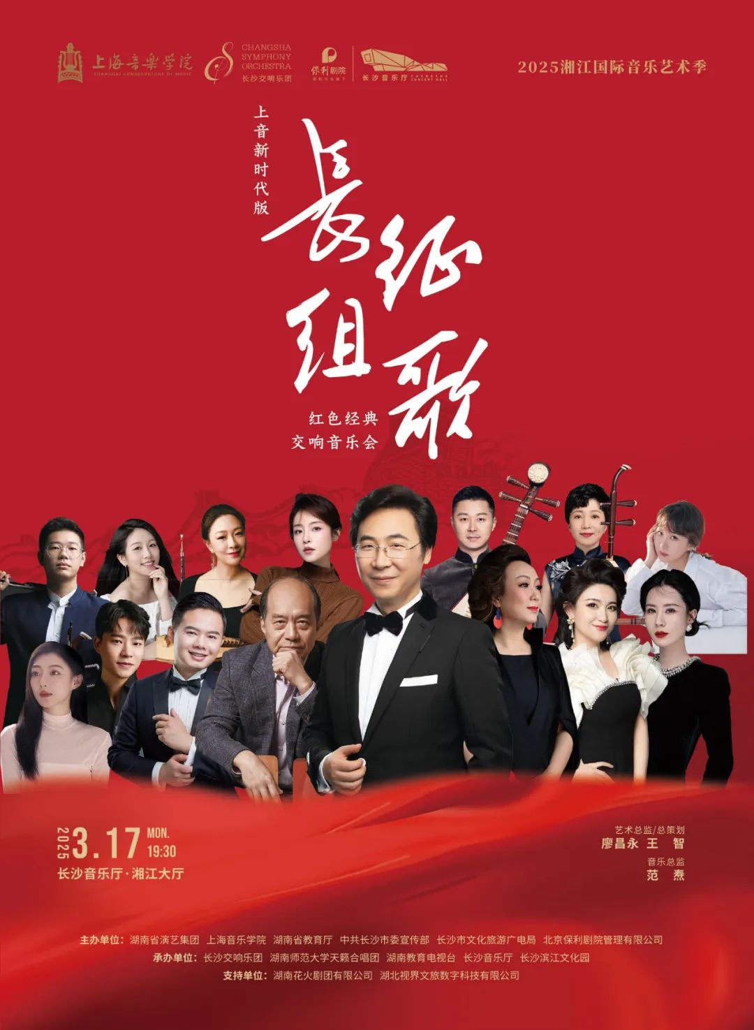 本场活动阵容强大。院长廖昌永与长沙交响乐团党总支书记、团长王智联袂担任音乐会艺术总监、总策划,廖昌永领衔主演。指挥家张国勇执棒长沙交响乐团,上音歌唱家李秀英、陈京蔚、陈家坡携手王山、刘辰旭、张功浩,演奏家邢立元、汤晓风、刘雯雯、陈泓璇携手钱蕊、陈子文、沈贝怡,与湖南青年歌唱家仇韬兀、贺继等参与演出。上音合唱团、湖南师范大学天籁合唱团组成二百余人合唱和声阵容,湖南教育电视台播音员储闻、姝然担纲音乐会篇章诵读和主持。