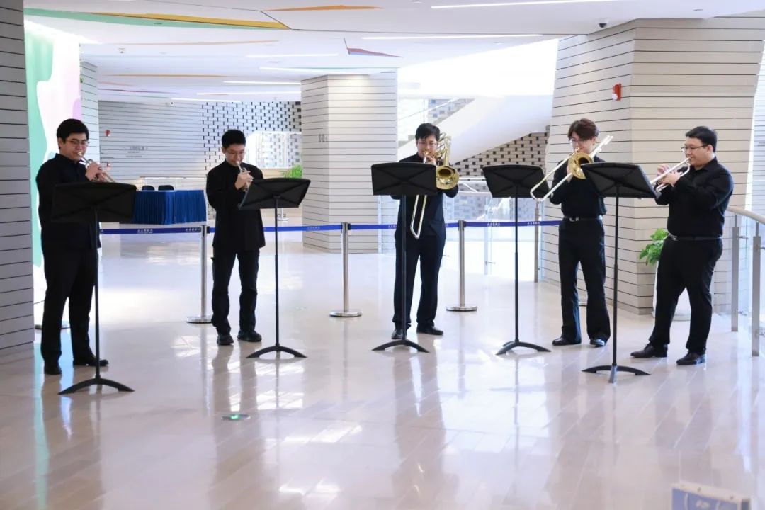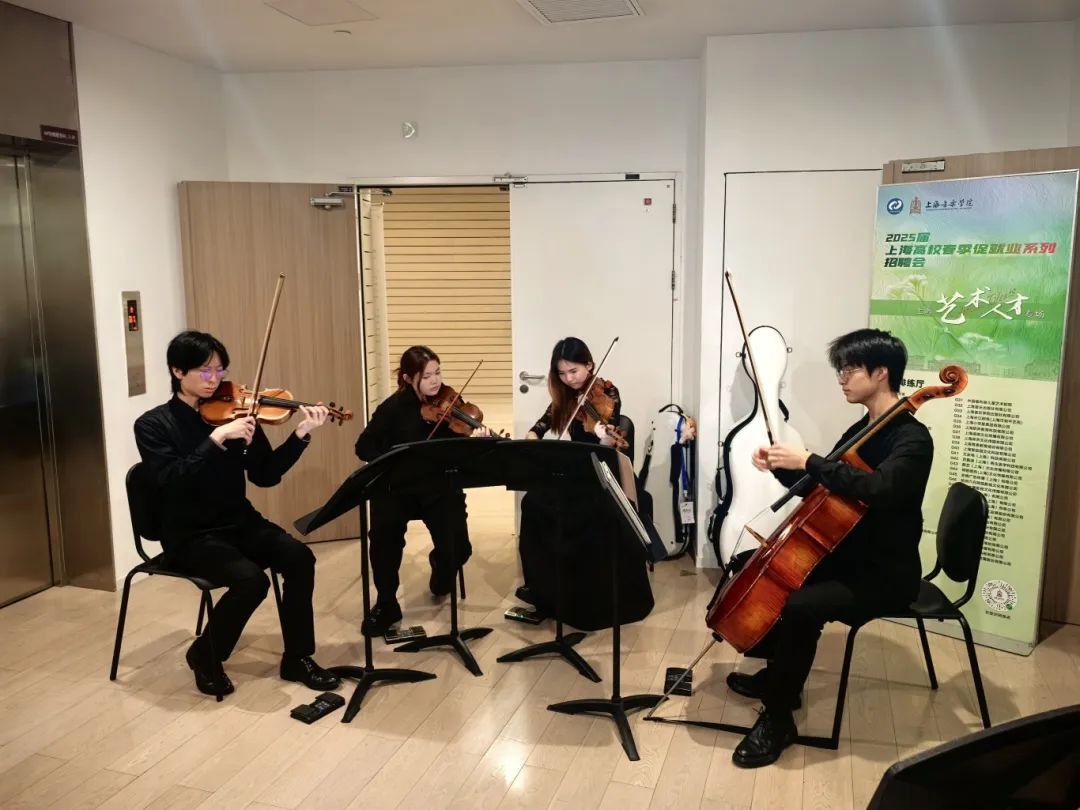 招聘会现场由上音优秀学生“音才助飞”计划孵化项目带来铜管、弦乐、竹笛、长笛四组音乐快闪。