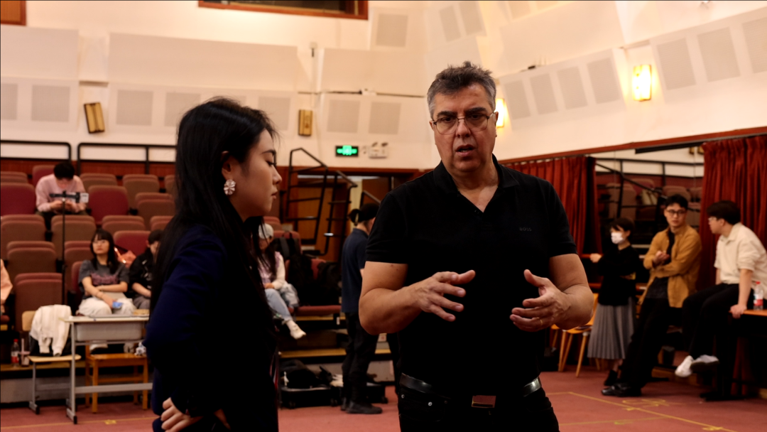 在此次上音版《茶花女》排演过程中,“联合指导”展现出合力优势。国际导演与本校教师共同指导,意大利导演马埃斯特里尼和助理导演林梅仔细打磨每一场戏,增加了许多戏剧细节,艺术指导、作曲指挥系教师管珺全程跟进,声乐歌剧系教授王凯蔚、黄萱现场给予音乐指导和督促,各系部专业老师也来到现场,观摩排练进展,掌握学生们实践的反馈,排练现场成了教学课堂的高效延伸。