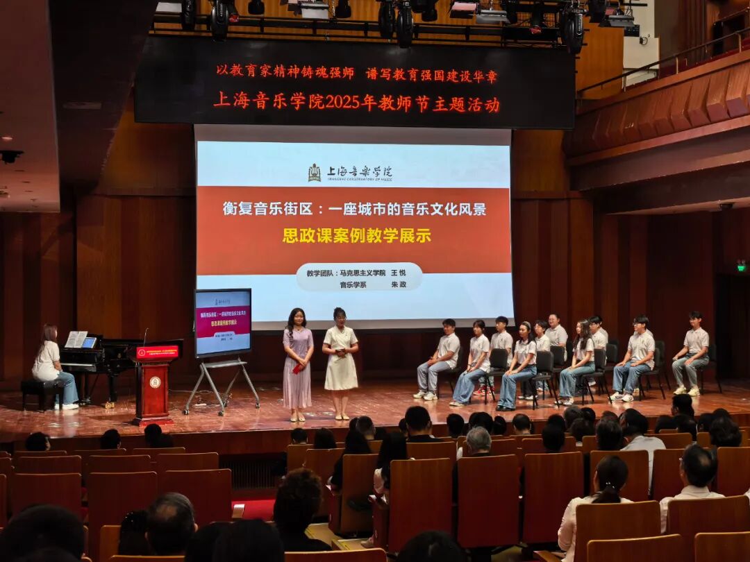教学成果展示环节,beat365英国官方网站第六届青年教师教学大赛基础课组一等奖获得者王悦、第二届思政课教学比赛一等奖获得者朱政组成的教学团队,带领音乐学系的同学们作思政课程教学展示。