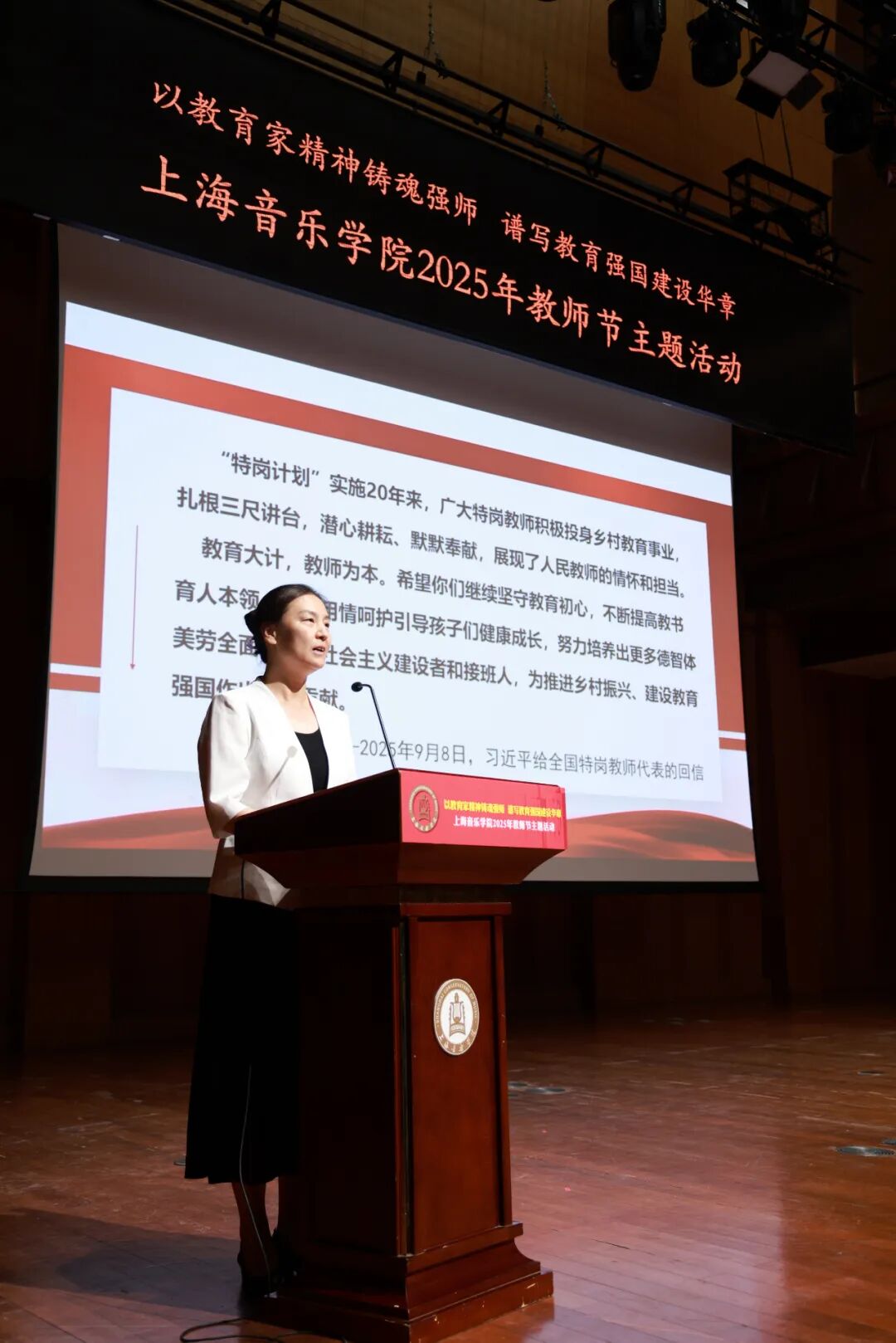 党委书记裴小倩在总结讲话中指出,习近平总书记在给全国特岗教师代表的回信中,要求老师们坚守教育初心,不断提高教书育人本领,努力培养出更多德智体美劳全面发展的社会主义建设者和接班人,为推进建设教育强国作出新的贡献。这是每一位教育工作者的神圣使命和责任担当,同时也是全体上音教师应该为之奋斗的价值追求。希望老师们铸信仰之魂,做“国之大者”的笃信者。把对马克思主义的信仰、对中国特色社会主义的信念、对中华民族伟大复兴的信心,熔铸为立身、立学、立教的灵魂。铸德行之魂,做“言为士则、行为世范”的践行者。深化“重视基础、严格教学、精于实践、善于总结”的质量文化,诠释“学高为师,身正为范”的深刻内涵。铸求是之魂,做“惟真惟新”的探路者。积极投身教育综合改革,致力于人才培养质效,实现育人质量提升和个人专业成长的双向奔赴,努力培养能够担当民族复兴大任的时代新人!