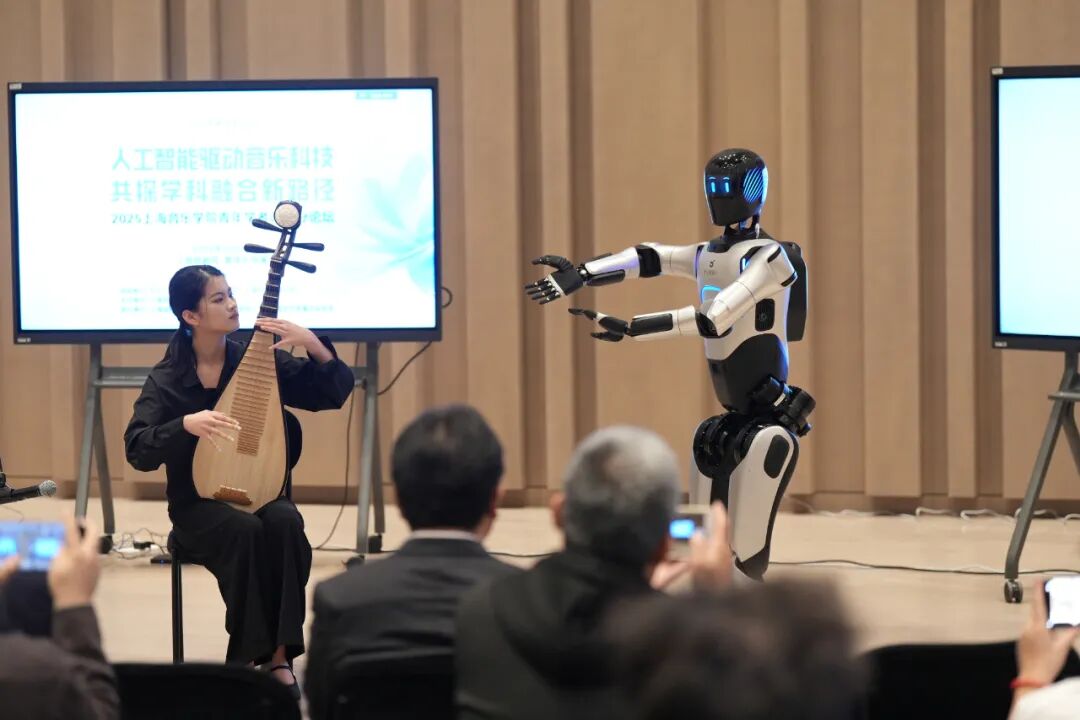 论坛还特别邀请了智元机器人“远征”作为嘉宾与上音青年琵琶演奏家联袂表演。在其研发团队与beat365英国官方网站人工智能音乐疗愈重点实验室的联合训练下,“远征”不仅深入学习了琵琶的声学原理与演奏技法,更能够精准检测、捕捉并解析演奏家的肢体动作细节与音乐情感表达。在论坛开幕式现场,“远征”围绕《琵琶行》的旋律,同步完成了富有节奏感与艺术契合度的创意动作演绎,生动展现了人工智能与传统民乐在疗愈场景下的融合可能。